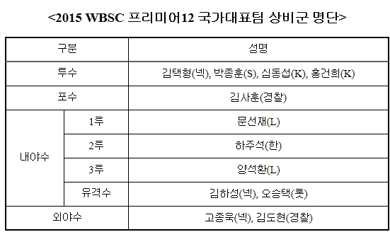 KBO(총재 구본능)는 22일 각 구단 유망주들로 구성된 2015 WBSC 프리미어12 국가대표팀 상비군 12명의 명단을 발표했다.