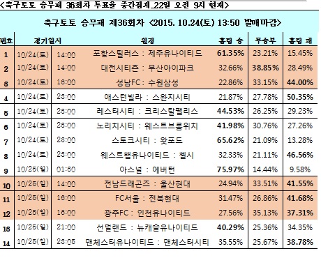 국민체육진흥공단(www.kspo.or.kr)이 발행하는 체육진흥투표권 스포츠토토(www.sportstoto.co.kr)가 오는 24일과 25일에 벌어지는 국내프로축구 K리그클래식 6경기와 잉글랜드프로축구 프리미어리그(EPL) 8경기 등 총 14경기를 대상으로 한 축구토토 승무패 36회차를 발행한다.