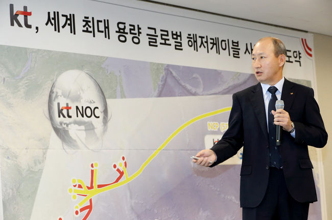 [사진] KT네트워크부문장 오성목 부사장이 KT가 구축 및 운용할 예정인 세계 최대 용량의 글로벌 해저케이블 사업에 대해 설명하고 있는 모습 /KT 제공