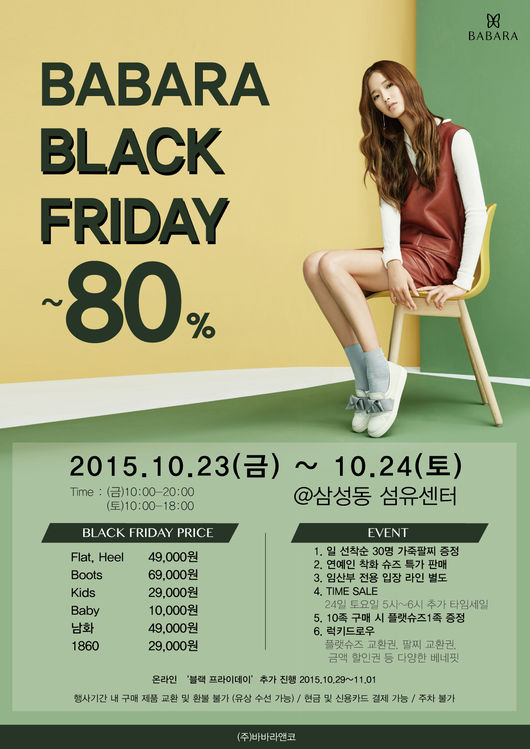 이번 블랙프라이데이 세일을 통해 바바라 제품을 최대 80%까지 할인된 가격으로 구입할 수 있으며, 여성 플랫슈즈, 힐, 샌들, 부츠를 비롯하여, 아동화, 남성화까지 바바라 전 제품을 선보일 예정으로, 삼성동 섬유센터에서 진행한다.