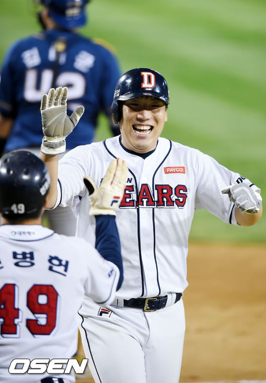 6회말 1사 주자 만루 두산 오재원의 선취 2타점 적시타때 홈을 밟은 민병헌과 김현수가 하이파이브를 하고 있다.