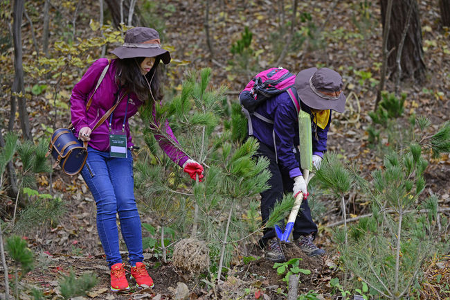 소나무 식수 행사 후에는 월악산국립공원 사문리 자연관찰로 트레킹과 단양팔경 관광, 충주호 유람선 투어를 통해 단풍 절경지로 꼽히는 월악산 일대를 돌아봤다.