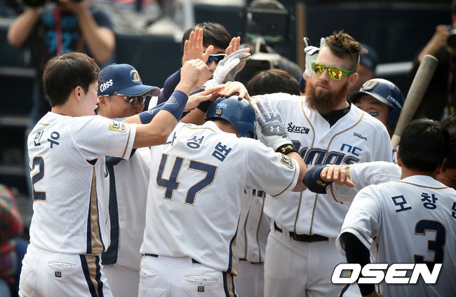 24일 오후 경상남도 창원 마산야구장에서 열릴 2015 타이어뱅크 KBO리그 포스트시즌 플레이오프 NC 다이노스와 두산 베어스의 5차전, 1회말 2사 1,2루에서 NC 이호준의 선제 적시타에 나성범이 홈을 밟고 동료선수들과 기뻐하고 있다.