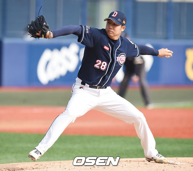 24일 오후 경상남도 창원 마산야구장에서 열린 2015 타이어뱅크 KBO리그 포스트시즌 플레이오프 5차전 NC 다이노스와 두산 베어스의 경기, 1회말 두산 선발투수 장원준이 역투하고 있다.