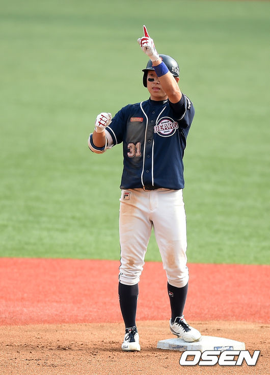 24일 오후 경상남도 창원 마산야구장에서 열릴 2015 타이어뱅크 KBO리그 포스트시즌 플레이오프 NC 다이노스와 두산 베어스의 5차전, 5회초 무사 2루에서 두산 정수빈이 동점 적시 2루타를 날리고 기뻐하고 있다.