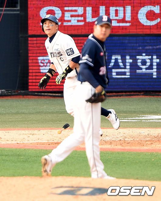 5회말 NC 공격 2사 1, 3루 상황 이종욱이 외야플라이를 치고 타구를 바라보고 있다.