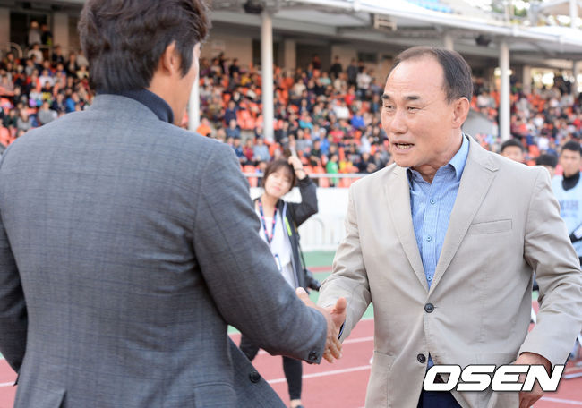 경기에 앞서 수원 서정원 감독과 성남 김학범 감독이 악수를 나누고 있다.