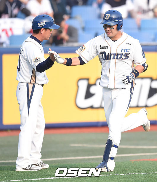 24일 오후 경상남도 창원 마산야구장에서 열린 2015 타이어뱅크 KBO리그 포스트시즌 플레이오프 5차전 NC 다이노스와 두산 베어스의 경기, 6회말 NC 지석훈이 솔로홈런을 날리고 이광길 코치와 하이파이브를 하고 있다
