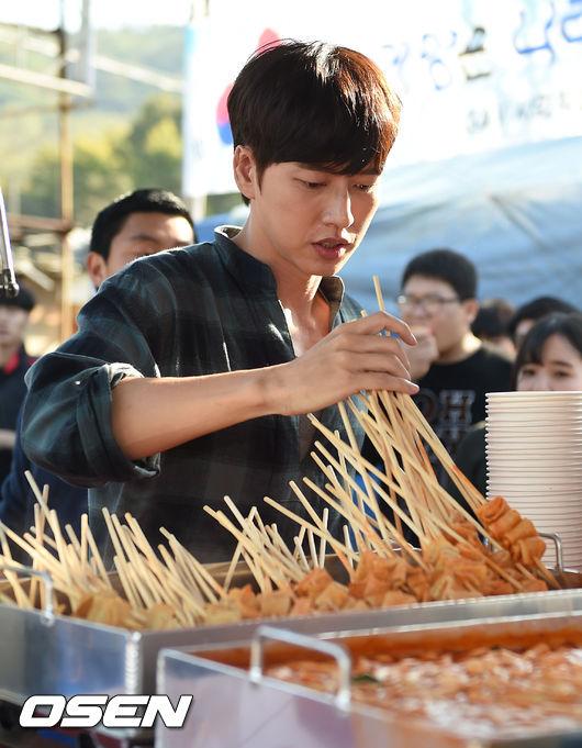 연탄배달을 끝낸 박해진이 간식으로 먹을 분식을 그릇에 담고 있다.