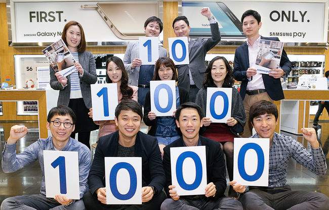 [사진] 삼성전자 모바일 결제 서비스 삼성 페이가 가입자 100만 명 달성을 비롯 '10·100·1000' 기록을 돌파하며 높은 호응을 얻고 있다. 8월 20일 공식 출시된 삼성 페이는 약 2개월만에 하루 결제건수 10만 건, 누적 가입자 100만 명, 누적 결제금액 1000억 원 이상을 넘어서며 국내 모바일 결제 서비스의 사용 저변을 넓혀 가고 있다. 사진은 삼성전자 삼성 페이 담당 직원들이 삼성 페이 '10·100·1000' 기록 돌파를 축하하는 모습.