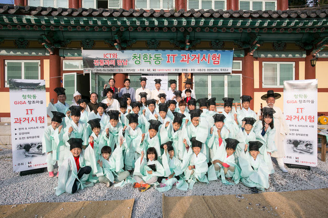 KT(회장 황창규, www.kt.com)가 24일 경남 하동군 청암면 묵계리에 위치한 청학동 기가창조마을 도서관 앞 마당에서 청학동 거주 어린이들을 대상으로 '청학동 IT 과거시험'을 치렀다고 밝혔다.