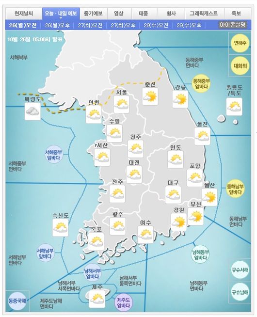 10월 26일 오전 현재 중부지방과 남부서해안은 구름많고, 그 밖의 지방은 대체로 맑은 날씨를 보이고 있다. 그러나 오늘은 동해상에 위치한 고기압의 가장자리에 들다가 북서쪽에서 다가오는 기압골의 영향을 점차 받는다. 전국이 가끔 구름많다가 점차 흐려져 늦은 밤에 경기서해안에서 비가 내릴 전망이다.