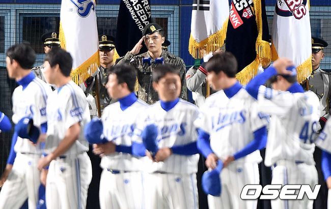 군 복무 중인 JYJ 김재중이 애국가 제창를 마치고 경례를 하고 있다.