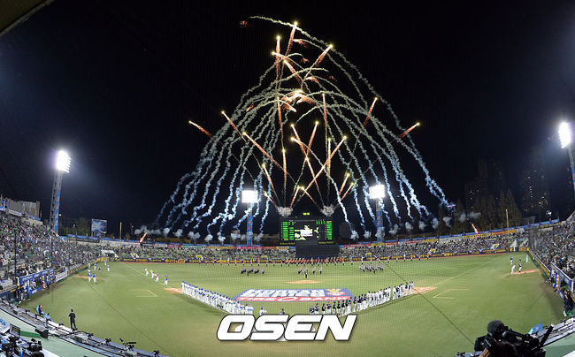 26일 오후 대구구장서 열린 ‘2015 타이어뱅크 KBO 리그’ 삼성 라이온즈와 두산 베어스의 한국시리즈 1차전 경기에 앞서 개회사가 선언되고 있다.