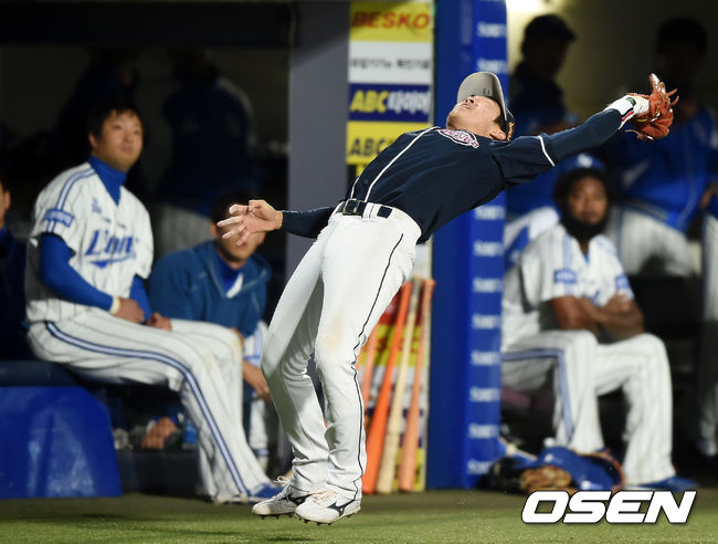 26일 오후 대구구장서 열린 ‘2015 타이어뱅크 KBO 리그’ 삼성 라이온즈와 두산 베어스의 한국시리즈 1차전, 3회말 2사 1루에서 두산 허경민이 삼성 최형우의 3루 파울플라이 타구를 잡아내고 있다.
