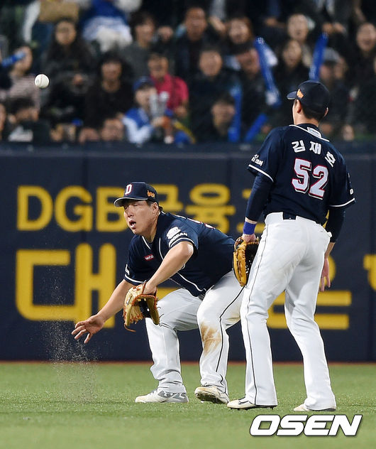 26일 오후 대구구장서 열린 ‘2015 타이어뱅크 KBO 리그’ 삼성 라이온즈와 두산 베어스의 한국시리즈 1차전, 4회말 무사에서 두산 김현수, 김재호가 삼성 이승엽의 타구를 놓치고 있다.