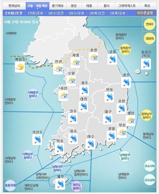 27일 기상청에 따르면 현재 전국에 비가 내리고 있으며 특히 전라남북도 서해안에는 시간당 20mm 내외의 강한 비가 내리는 곳이 있다. 이 비는 낮에 대부분 그칠 예정이며 오후에 서쪽지방부터 점차 맑아질 전망이다.