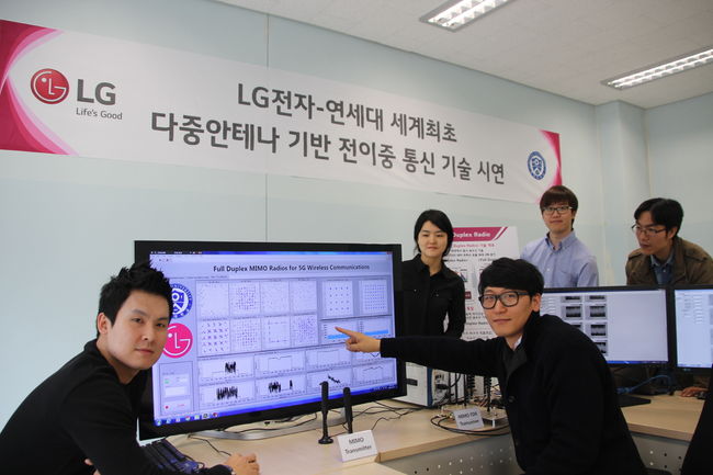 LG전자(066570, www.lge.co.kr)가 26일 세계최초로 다중안테나(MIMO, Multiple Input Multiple Output) 기술 기반 ‘FDR(전 이중 통신)’ 통신기술을 연세대학교와 공동 개발해 시연함으로써 5G의 핵심 기술을 선점했다고 밝혔다.
