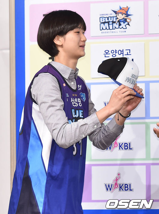 27일 오전 서울 청담동 리베라호텔에서 열린 2016 WKBL 신입선수 선발회에서 1라운드 삼성생명에 지명된 윤예빈이 모자를 건네받고 있다.