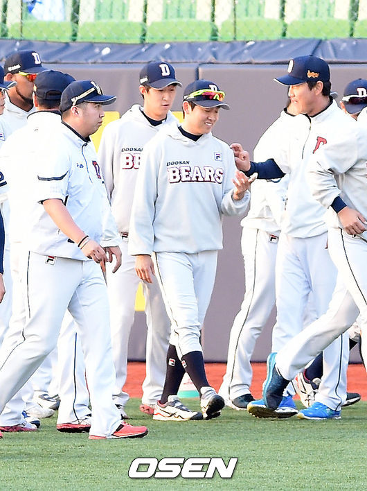 27일 대구구장에서 열리는 '2015 타이어뱅크 KBO리그' 한국시리즈 2차전 삼성 라이온즈와 두산 베어스의 경기에 앞서 손가락 부상 당했던 정수빈이 코칭스태프와 이야기를 나누고 있다.