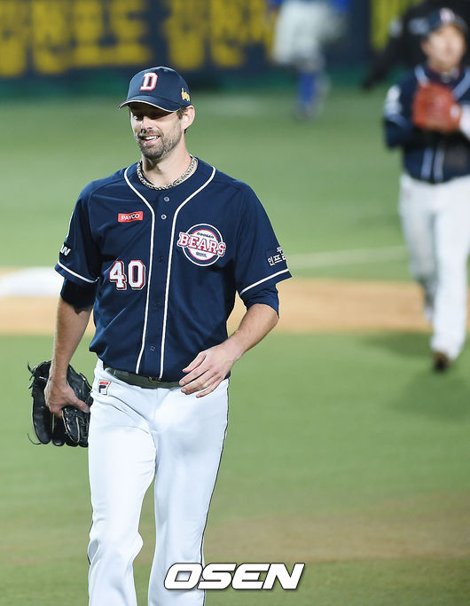 27일 대구구장에서 열린 '2015 타이어뱅크 KBO리그' 한국시리즈 2차전 삼성 라이온즈와 두산 베어스의 경기, 1회말 삼성 공격을 막은 두산 선발투수 니퍼트가 미소 지으며 더그아웃으로 들어가고 있다.