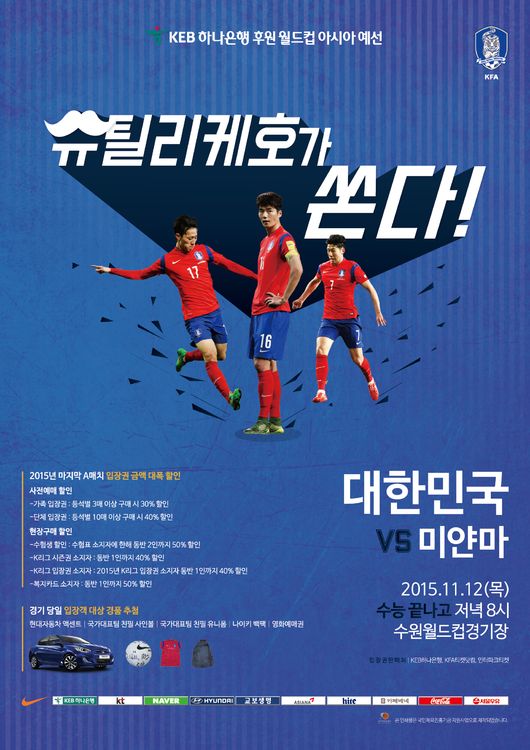 대한축구협회는 올해 국내에서 열리는 마지막 A매치인 미얀마전을 맞아 한 해 동안 성원을 보내준 팬들에게 보답하는 차원에서 ‘슈틸리케호가 쏜다’는 슬로건 아래 다양한 할인 혜택과 경품을 제공한다.