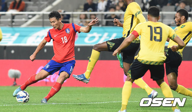 득점에 대한 욕심을 드러낸 지동원은 전반 35분 성과를 냈다. 지동원은 정우영의 코너킥을 가까운 포스트에서 헤딩으로 연결해 자메이카의 골문을 흔들었다. 2011년 9월 레바논전에서 2골을 넣은 이후 4년 1개월여 만에 대표팀에서 넣은 골이었다. 지동원은 이정협, 황의조와 함께 대표팀 골잡이 경쟁에 뛰어들었다.
