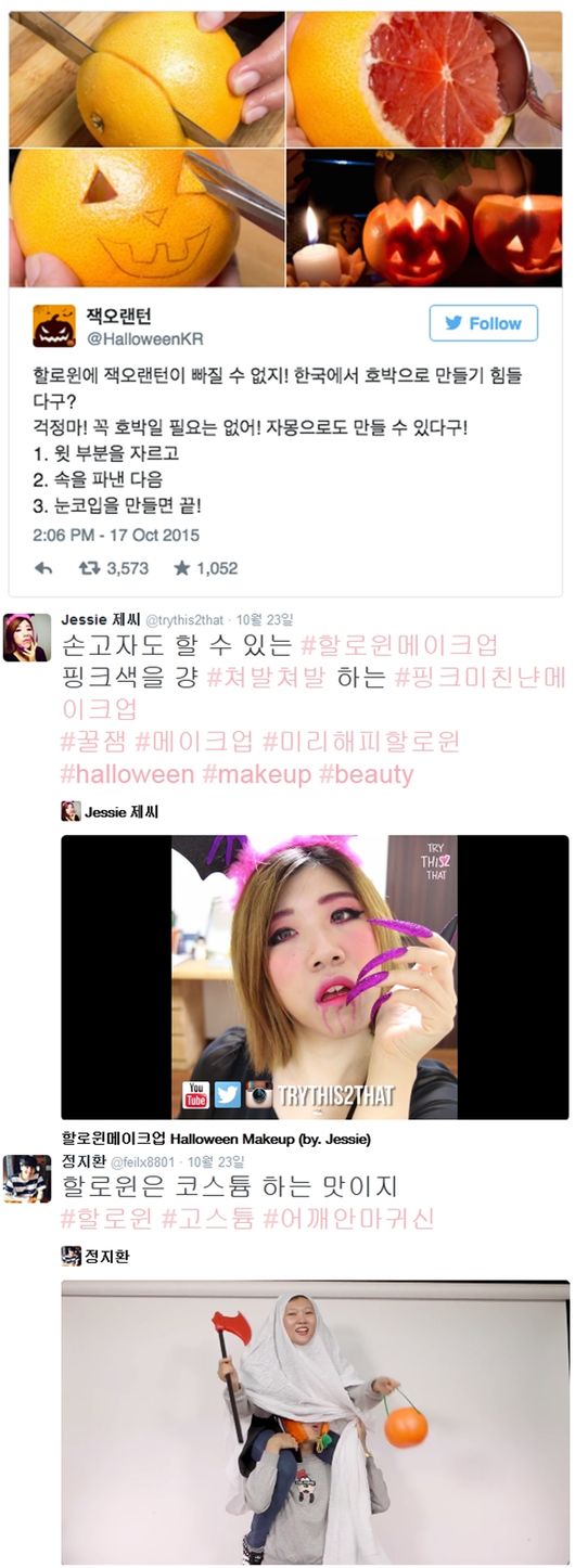 [사진] 위로 부터 '귤오랜턴' 트위터, DIA TV 정지윤의 할로윈 메이크업 방법 영상 트윗, 비디오빌리지 정지환, 선여정의 커플용 거인 괴물 분장법 영상 트윗 / 트위터 제공