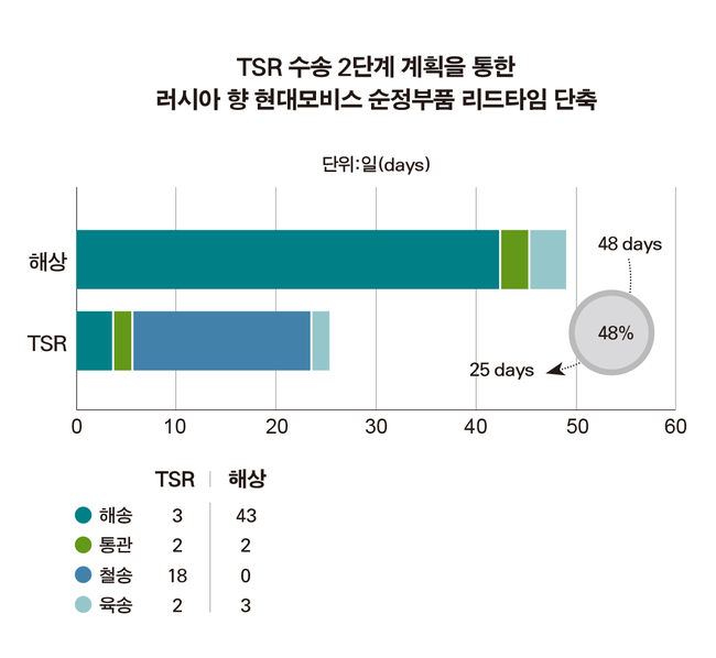 현대모비스는 올 2월부터 9월까지 시범운영을 실시했다. 이를 통해 기존 2만 2000km에 달했던 러시아 향 자동차 보수용 부품의 운송 거리를 42% 수준인 9200km로 단축했다. 부산~러시아 극동 보스토치니항 900km 해상운송, 보스토치니~예카테린부르크 8300km TSR 구간 운송을 성공적으로 운영했다.