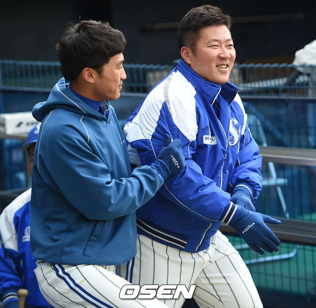 29일 오후 서울 잠실야구장에서 열린 삼성 라이온즈와 두산 베어스의 2015 타이어뱅크 KBO리그 한국시리즈 3차전에 앞서 삼성 박해민과 최형우가 이야기를 나누며 훈련에 나서고 있다.