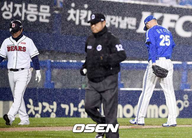 29일 오후 서울 잠실야구장에서 열린 삼성 라이온즈와 두산 베어스의 2015 타이어뱅크 KBO리그 한국시리즈 3차전,1회말 우천 경기중단에 삼성 선발투수 클로이드가 마운드를 내려가고 있다.