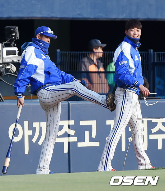 [OSEN=잠실, 민경훈 기자 30일 오후 서울 잠실야구장에서 삼성 라이온즈와 두산 베어스의 2015 타이어뱅크 KBO리그 한국시리즈 4차전이 열릴 예정인 가운데 양팀 훈련시간에 삼성 정인욱이 두산 허경민과 인사를 나눌때 카도쿠라 코치에게 엉덩이를 걷어차이고 있다.