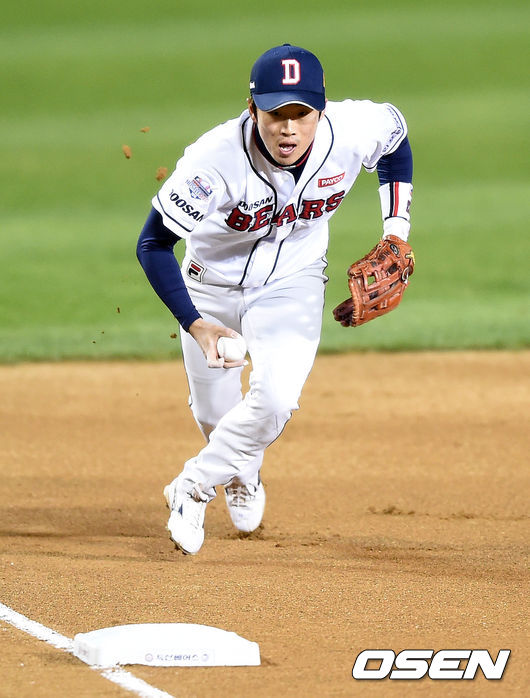 [OSEN=잠실, 지형준 기자 30일 오후 서울 잠실야구장에서 열린 삼성 라이온즈와 두산 베어스의 2015 타이어뱅크 KBO리그 한국시리즈 4차전, 1회초 무사 1,2루에서 두산 허경민이 삼성 나바로의 3루땅볼에 병살을 완성하고 있다.