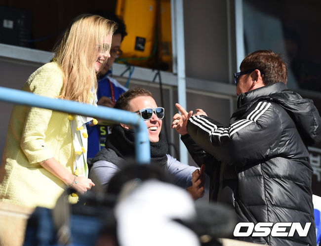 31일 오후 서울 잠실구장에서 열린 '2015 타이어뱅크 KBO 리그' 한국시리즈 두산 베어스와 삼성 라이온즈의 5차전, 삼성 전력분석원 진갑용이 밴덴헐크, 아내 애나와 인사를 나누고 있다.