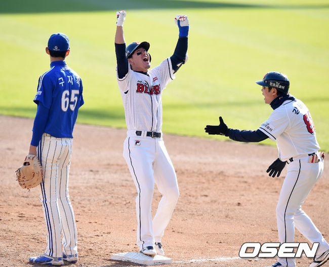 31일 오후 서울 잠실구장에서 열린 '2015 타이어뱅크 KBO 리그' 한국시리즈 두산 베어스와 삼성 라이온즈의 5차전, 3회말 2사 1,3루에서 두산 김재호가 1타점 적시타를 날리고 포효하고 있다.