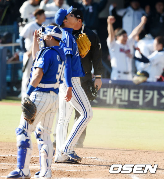3회말 2사 주자 1,3루 두산 허경민 타석에서 삼성 정인욱의 폭투를 틈타 3루 주자 고영민이 홈을 밟자 정인욱이 아쉬워하고 있다.