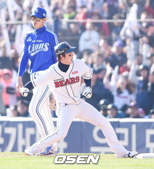 31일 오후 서울 잠실구장에서 열린 '2015 타이어뱅크 KBO 리그' 한국시리즈 5차전 두산 베어스와 삼성 라이온즈의 경기,3회말 2사 만루 두산 고영민이 2타점 적시타를 날린뒤 환호하고 있다.