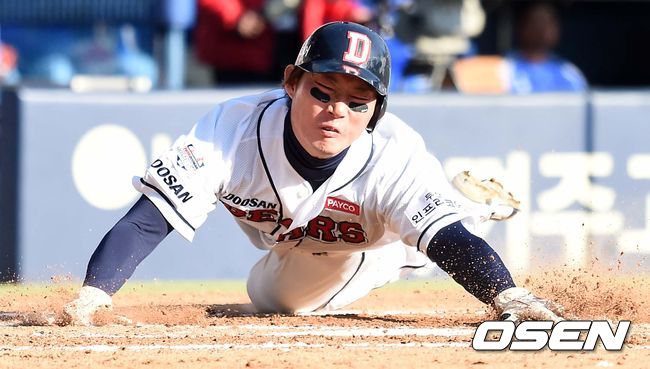 3회말 두산 공격 2사 1, 3루 상황 허경민 타석 때 3루 주자 고영민이 삼성 투수 정인욱의 폭투를 틈타 홈까지 내달려 세이프되고 있다.