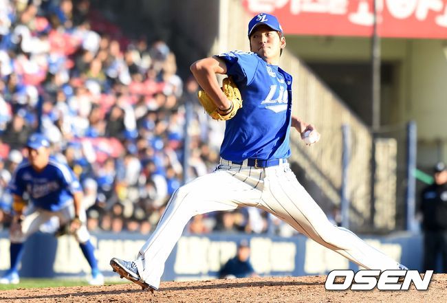 6회말 두산 공격 때 마운드에 오른 삼성 투수 백정현이 힘차게 공을 뿌리고 있다.