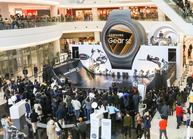 삼성전자가 서울 영등포 타임스퀘어에서 '기어 S2'의 원형 휠과 새로운 혁신 기능을 BMX(Bicycle Motocross) 자전거로 표현하는 '기어 S2 휠 퍼포먼스' 행사를 오는 8일까지 진행한다.