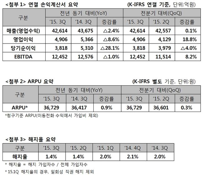 SK텔레콤(대표이사 사장 장동현, www.sktelecom.com)은 국제회계기준(K-IFRS) 연결 재무제표 기준으로 2015년 3분기 매출 4조 2614억 원, 영업이익 4906억 원, 순이익 3818억 원을 기록했다고 2일 밝혔다.