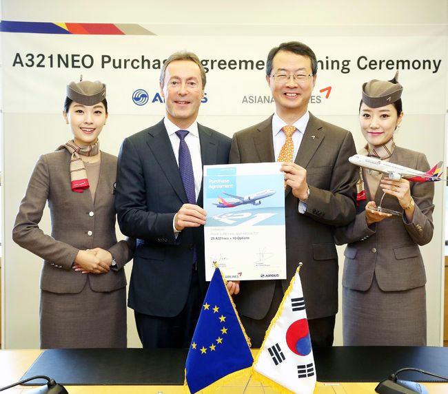 아시아나항공(사장 김수천)이 3일 강서구 오쇠동 아시아나타운에서 김수천 아시아나항공 사장과 파브리스 브레지에(Fabrice Bregier) 에어버스 CEO 등이 참석한 가운데 에어버스사의 차세대 중소형기 A321-200 NEO(New Engine Option) 25대의 구매 및 도입을 위한 서명식을 가졌다.