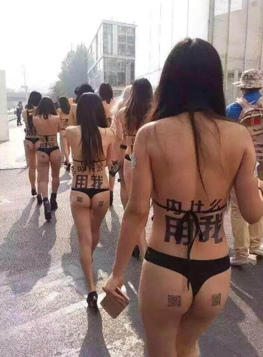 11월 3일 중국의 수도 북경에서는 쌀쌀한 늦가을 날씨임에도 불구하고 비키니 수영복을 착용한 약 10여명의 여성들의 자신들의 노출된 등에 새롭게 런칭하는 스마트폰용 어플리케이션의 광고 문구를 적어 놓고 거리를 활보하여 큰 화제가 되면서 여성들의 노출된 신체 부위를 이용한 광고가 중국의 새로운 광고 기법으로 관심을 모으고 있다. /OSEN=베이징, 진징슌 통신원