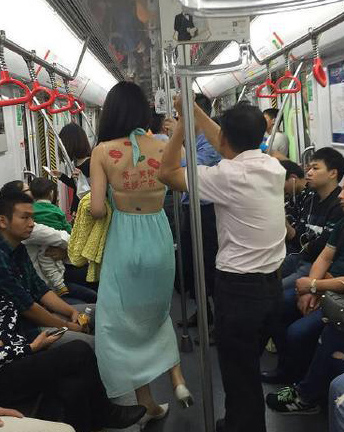 당시 중국의 웨이보에는 항저우의 지하철 1호선에 자신의 등 대부분을 드러낸 의상을 입은 여성이 등에 광고 문구를 적어 넣은 뒤 지하철을 활보한 사진이 올라와 많은 중국 네티즌들의 관심을 끈 것이다. 등에는 여성의 입술 모양의 마크와 함께 “함께 마라탕 (맵게 요리한 중국의 탕요리) 먹을까요”라는 광고 문구를 적은 뒤 지하철 차량 구내를 활보하여 많은 이들의 이목을 모으는 데 성공한 것이다.