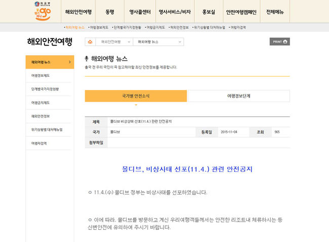 외교부는 5일 지난 4일 몰디브 정부의 비상사태 선포 소식을 해외여행 뉴스란에 공지했다. 외교부는 "몰디브를 방문하고 계신 우리여행객들께서는 안전한 리조트내 체류하시는 등 신변안전에 유의하여 주시기 바랍니다"며 몰디브 비상사태 선포와 관련한 안전 공지를 했다.