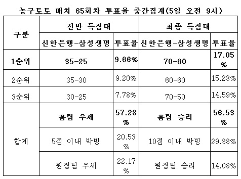 체육진흥투표권 수탁사업자인 케이토토는(www.ktoto.co.kr)는 6일 오후 7시에 인천도원체육관에서 열리는 신한은행-삼성생명전을 대상으로 한 농구토토 W매치 65회차 투표율을 중간 집계한 결과, 전체 참가자의 56.53%가 홈팀 신한은행의 승리를 예상하는 것으로 나타났다고 밝혔다.