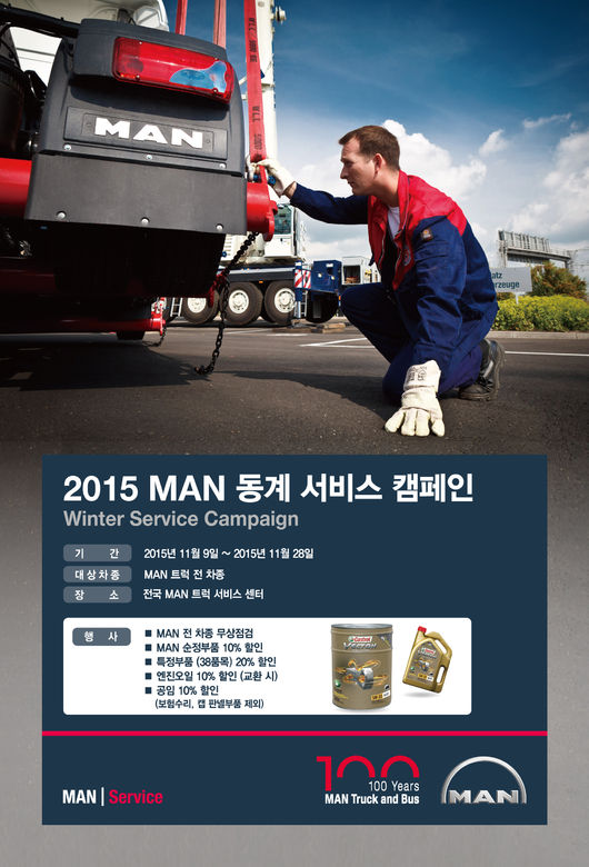 상용차 생산업체인 MAN그룹의 한국지사인 만트럭버스코리아(주)가 오는 9일부터 28일까지 3주 간, MAN이 생산한 전 차종을 대상으로 ‘2015 겨울 서비스 캠페인’을 실시한다.