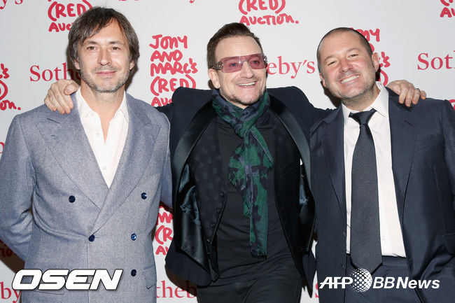 [사진]마크 뉴슨(왼쪽)이 지난 2013년 뉴욕에서 열린 한 자선행사에서 보노와 조니 아이브와 함께 포즈를 취하고 있다. ⓒAFPBBNews = News1(무단전재 및 재배포 금지)