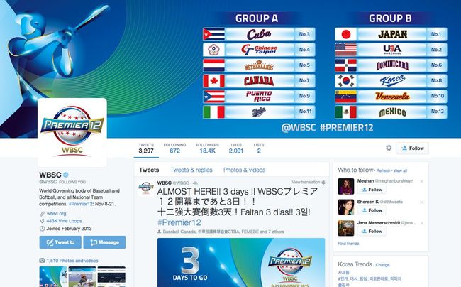 대회 주최 기관인 WBSC 트위터 공식 계정에서는 프리미어12 경기와 관련된 다양한 소식과 정보를 확인할 수 있다. 특히 오늘 저녁 7시부터 트위터의 '투표' 기능을 활용해 8일 열리는 개막전인 한일전의 승자를 예측하는 투표가 시작된다.