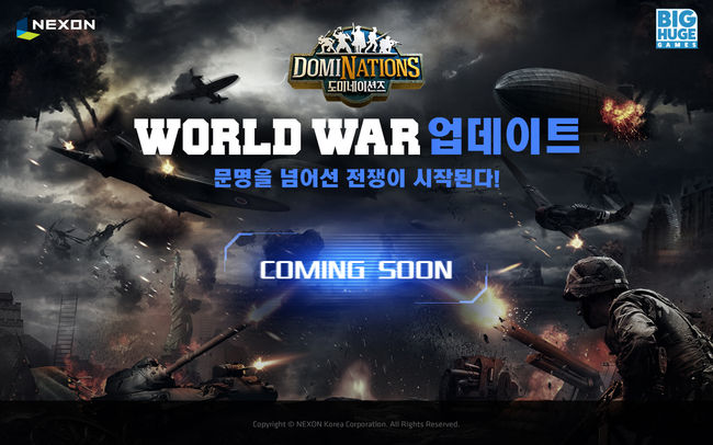 넥슨은 6일 빅휴즈게임즈가 개발한 인기 모바일 전략 게임 ‘도미네이션즈’의 대규모 업데이트 ‘월드 워’를 앞두고 티저 사이트를 오픈했다.